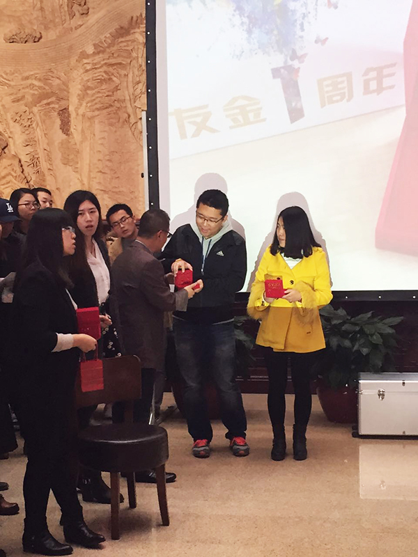 周年庆典上,友金所邀请了五位特别客户,他们分别是第一位投资客户、与友金所同一天生日的客户以及三位第一批投资客户代表。副总裁庞立军代表友金所向客户们表达了诚挚的谢意,并送上了专属礼品。