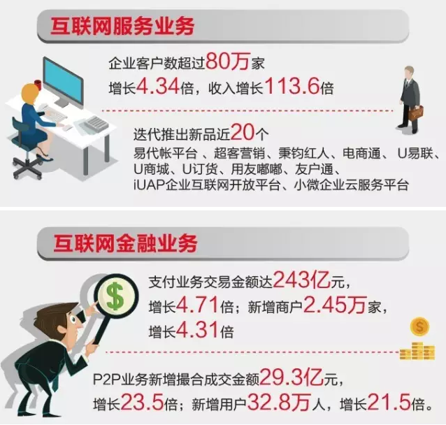 用友网络科技股份有限公司(600588)今晚发布2015年年度报告:软件业务平稳发展,企业互联网服务、互联网金融业务高速增长,其中友金所业绩暴增23.5倍。