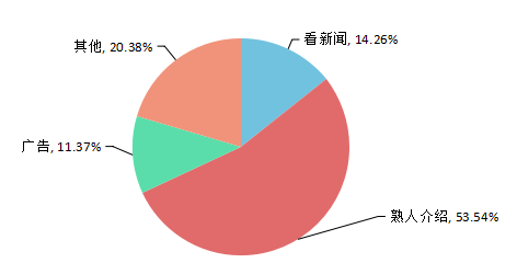 2、53.54%的财会人员是通过熟人介绍而进行网贷投资的;看新闻的占比14.26%,广告的仅为11.37%。