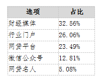 财经媒体、行业网站、网贷平台是三个主要的资讯来源,而财经媒体占据首位,这是因为财经媒体既具备一定的专业性,又秉持相对客观的立场。如进一步分析,行业网站、公众号等所发的内容,特别是高质量的内容,很多也是来源于财经媒体,因此,财经媒体的影响力还是非常大的。