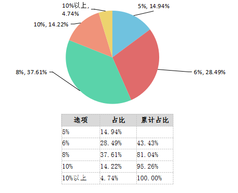5、在安全前提下,43.43%的人可以接受不高于6%的收益率;81.04%的人接受不高于8%的收益率。