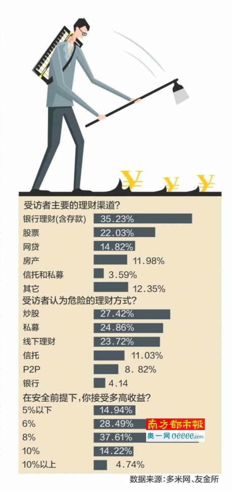 在常见的理财方式中,备受争议的网贷P 2P竟然成为第三大理财渠道。记者看到,银行理财(含存款)的人气指数为35.23%,股票为22.03%,网贷为14.82%,高于房产的11 .98%和信托私募的3.59%。
