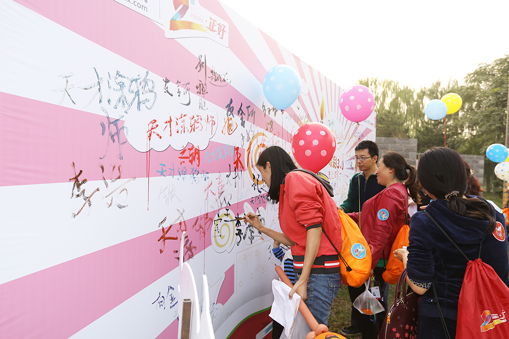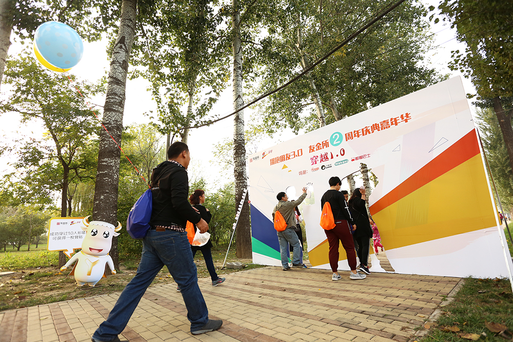 生日会现场,来自全国各地的300位投资人,其中包括两位和用友友金所同一天生日的投资人参加了用友友金所的生日庆典和跨越3.0的地面活动,在1.0现场有一个泡沫人形墙,需要穿越者摆着特殊pose传过去;2.0现场跨越障碍创意相框拍照,创意相框包括福布斯、今日头条、用友友金所等元素;3.0现场进行涂鸦彩绘。顺利通过每个阶段后,会获得一枚臂贴,集齐三枚臂贴可以换一个用友友金所定制勋章一枚。