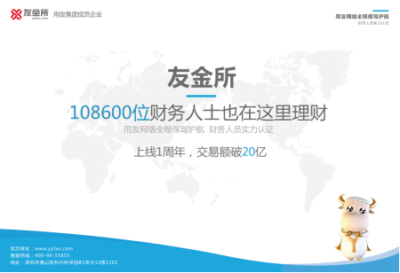 友金所承继了股东方用友网络——亚洲最大、中国最强的财务软件与ERP软件提供商百万级的优质企业客户资源与投资理财需求,积极吸收并发挥用友27年的财务管理经验;并积极联盟用友旗下兄弟平台,如畅捷通,共赢成长,塑造个性鲜明的“个人理财专家”定位,为投资客户提供安全、便捷、可信的优质理财产品。