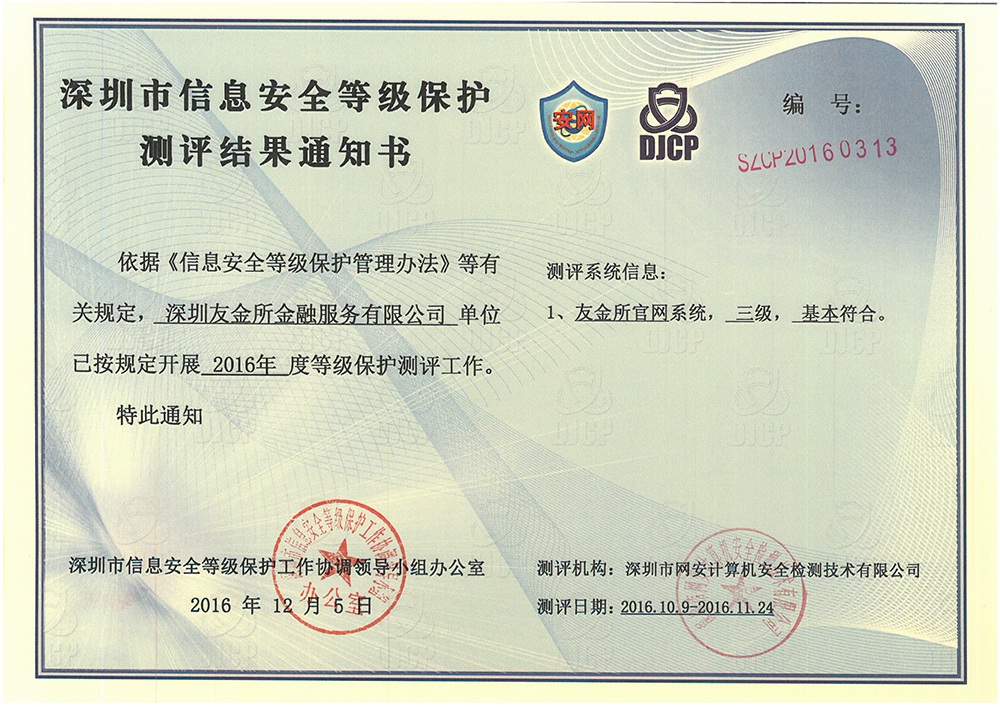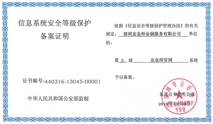 今日(2016年12月7日),公安部门核准颁发给友金所“国家信息安全等级保护三级备案证明”,证书编号:440316-13045-00001,目前《网络借贷信息中介机构业务活动管理办法》(以下简称“《办法》”)正式出台后,只有少量平台获得该证书,而友金所以91.6的高分获得该证书,这是非持牌金融机构所能获得的最高等级系统安全证书。